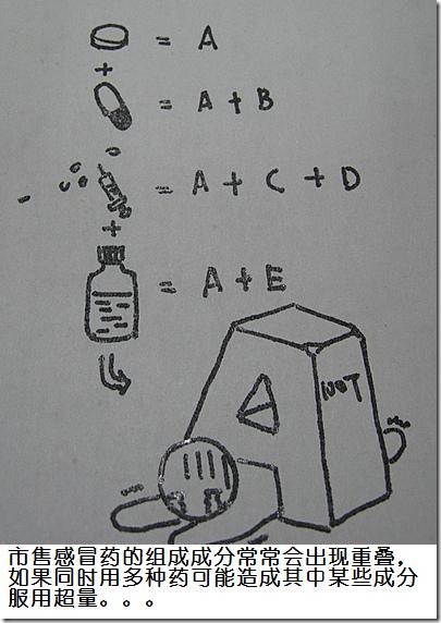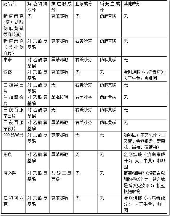 在服用感冒药时,最需要注意的问题是防止重复用药。我在文章的最后列出了一张常见感冒药的成分表,从表中可以看出,不同品牌的感冒药中,成分的重叠很多,有的甚至只是名字不同,所含成分完全一样。这就意味着,如果同时服用几 种感冒药,很容易造成某些成分服用量超出安全限额。而药物一旦服用超量,安全性就失去了保证。例如对乙酰氨基酚,在大剂量下对肝脏的损伤很明显。因此,使用感冒药时一般不要同时用两种或两种以上,即使同时用几种药物,也一定要确定其中没有重复的或是同一类的成分,以免造成不良后果。